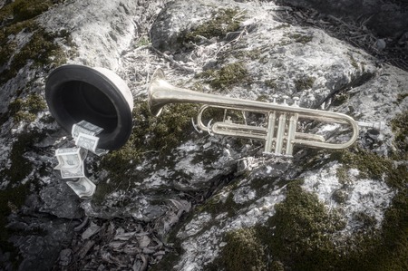 Traveling musicians trumpet and handkerchief picnic sack on a stick resting against outdoor old metal loveseat