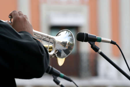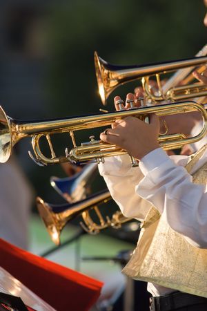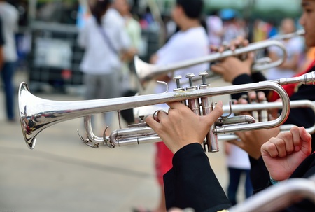 Close up and details of playing musicians, instruments in a marching, show band or music band