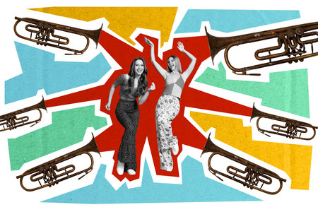 Contemporary artwork banner collage of two happy girls dance together music horn melody concert band performance celebration
