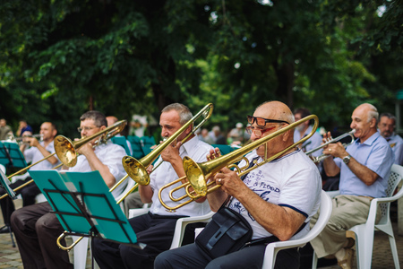 ARMAVIR, RUSSIA - JULE 02, 2016: Men play musical instruments in the orchestra in the park on a summer day