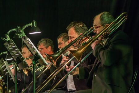 Concert view of a trombone player trombonist with musical jazz band performing