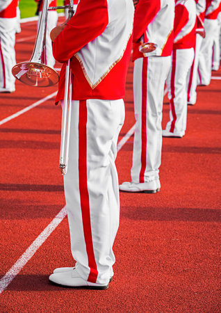 Focused young musician playing trombone in a marching band parade, wearing a red uniform