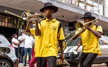 Johannesburg, South Africa, April 29-2018: Buskers playing on the streets. Brass band performing in the city.