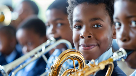 a Black boy practicing a musical instrument in school band