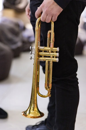 Close-up of a musician in black clothing holding a shiny, golden brass trumpet vertically before a performance.