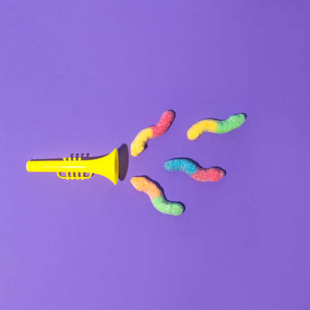 Yellow trumpet with colorful sweet candies. On a purple background. Minimal composition.