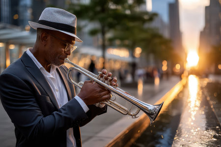 A man in a suit and hat plays the trumpet near a water feature at sunset, surrounded by urban beauty.