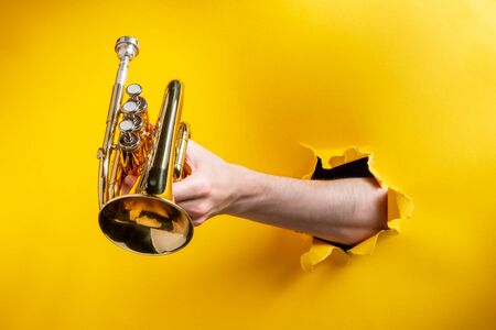 Hand giving a pocket trumpet through torn yellow paper background