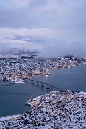 Aerial view to the city of Tromso in winter from the mountain ledge Storsteinen, 421 m above sea level , Northern Norway