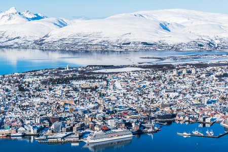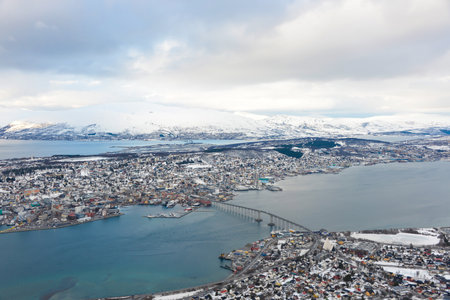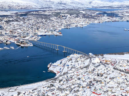 Tromso, Norway - November 17, 2019: Above view of beautiful winter landscape of snow covered town Tromso in Northern Norway