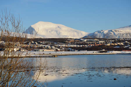 langnes side of the city island of tromsoe with snowy mountain and fjord