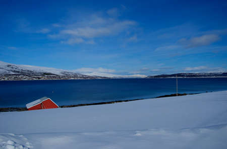 Waterscape with snow-covered mountains on the fjord shore near Tromso, Norway
