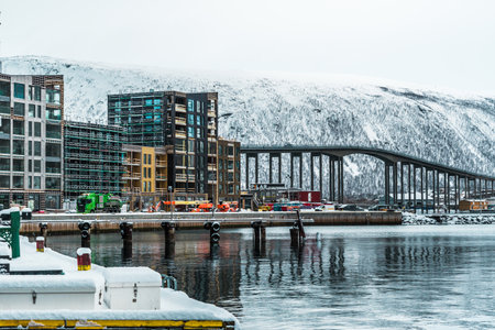 Tromso harbour, Norway, March 3rd 2022: New modern buildings and bridge to Tromsdalen on a winter day