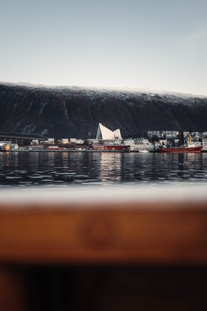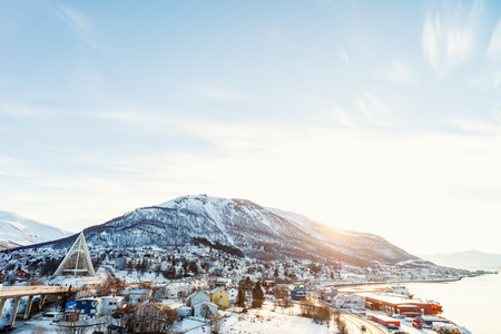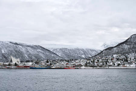 Cathedral in the winter landscape of the port of Tromso in a fjord on the coastline of northern Norway with snow covered mountains in the background
