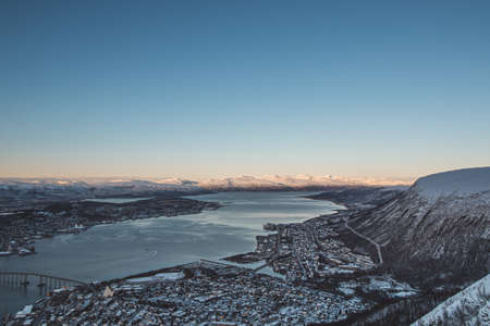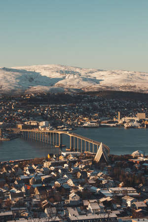 View of the polar town of Tromso in northern Norway and the snowy hills in the background at sunset. The landmark of this Paris of the North - Tromso bridge in Finnmark county, Norway.