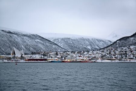 Tromso, Norway - November 17, 2019: Fjord water and town houses in northern Norway under deep snow cover
