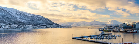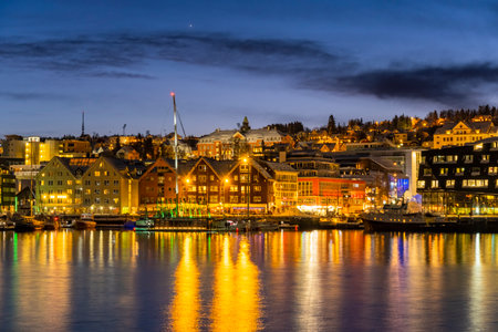 Panorama of the Norwegian city of Tromso on a winter evening during the Christmas season. The boat dock and downtown are illuminated by city lights.