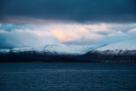 Sunset sky over snowy arctic mountain next to fjord in Tromso, Norway