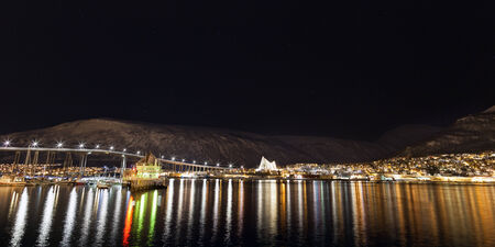 Panorama of port and harbour with famous Tromso Bridge across Tromsoysundet strait in the background, photographed at night, Northern Norway