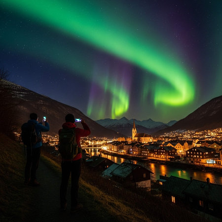Two people capture the breathtaking moment of the Northern Lights illuminating the night sky above a serene cityscape, with mountains and a river in the background.
