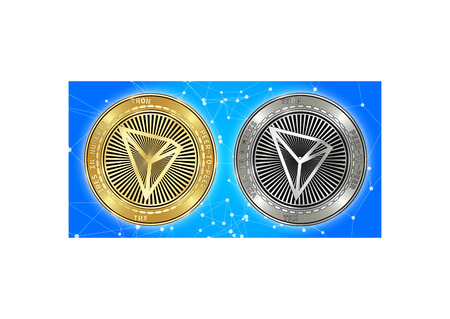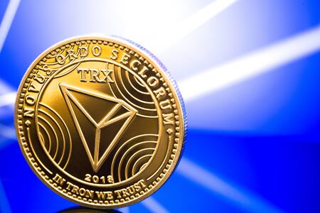 Golden and silver Tron (TRX) cryptocurrency coins on blockchain blue background. Tron (TRX) cryptocoin concept. Schematic blue blockchain