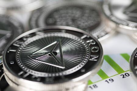 Digital currency physical metal silver ethereum coin. Cryptocurrency money concept.