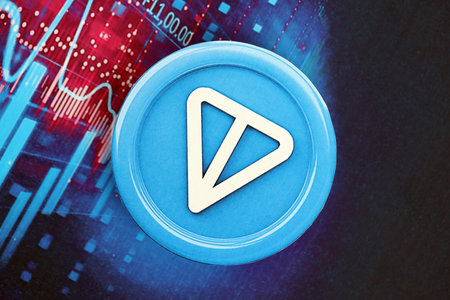 KYIV, UKRAINE - OCTOBER 9, 2025 TON Toncoin cryptocurrency coin sticker on futuristic blue chart banner. Concept of modern crypto money