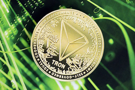 The coin cryptocurrency Tron on the background of wires and circuits. Token TRX.