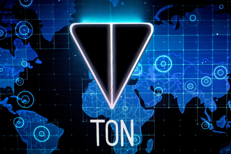 Kazan, Russia - Nov 14, 2021: The Open Network is a blockchain-based decentralized computer network technology. Cryptocurrency coin on the background of the TON Coin logo.