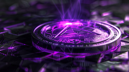 A visually striking purple coin symbol set against a digital background, illustrating themes of cryptocurrency and technological innovation with a futuristic appeal.