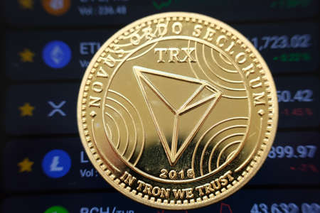 TRON currency with blockchain concept on laptop and charts and graphs.