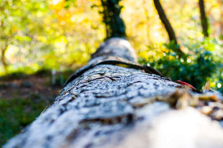Forest, tree trunk in horizontal orientation, pine bark in blur for the background
