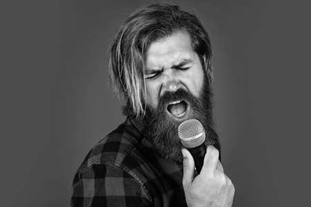bearded man wearing checkered shirt. rock music. male karaoke singer. mature charismatic male vocalist. guy with beard singing in microphone. confidence and charisma on stage