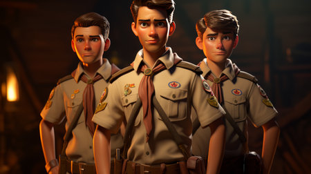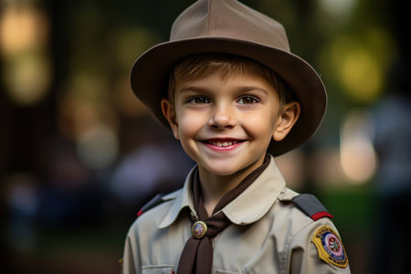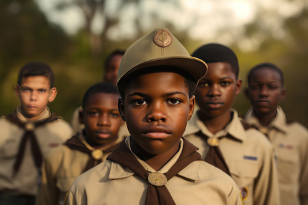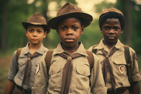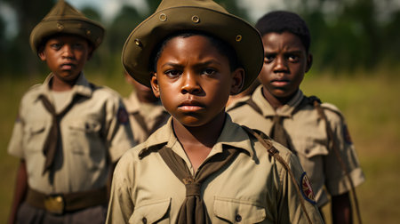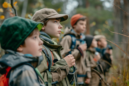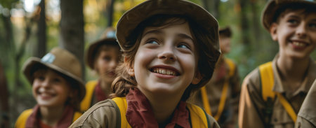 A girl leading an outdoor expedition, dressed as a ranger, with a group of boys and girls following her, learning about nature and survival skills.