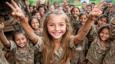 A group of smiling children in camo uniforms raise their hands enthusiastically, showing victory signs and cheering.