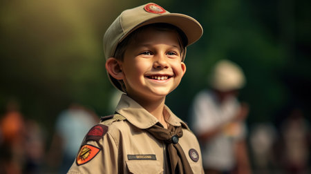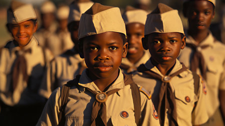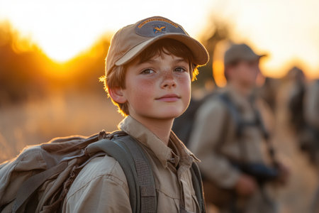 A young boy with a backpack looks confidently at the camera, his friends in the background, all dressed for an outdoor adventure. The golden glow of sunset highlights the camaraderie during their camp experience.