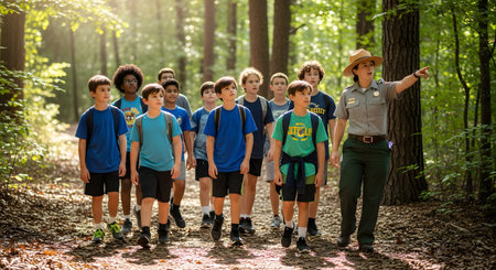 A female park ranger in a uniform and hat leads a group of attentive young boys on a guided hike along a sunlit trail in a dense forest. She is pointing forward, educating the children about nature during a field trip or summer camp activity.