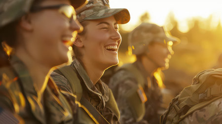 Disciplined diverse american soldiers in camouflage uniforms stand in a line formation and render a crisp hand salute during an outdoor military ceremony in golden sunlight.