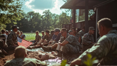 American military stand with their backs looking usa flag on the street with rain, Memorial Day, Independence day, AI Generative.