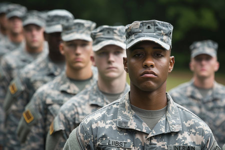 A group of young soldiers stand in a row, the focus on one man's contemplative expression, embodying discipline and readiness.