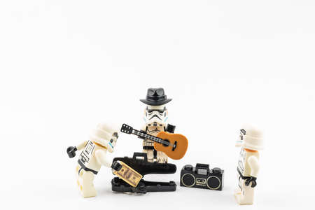 Bangkok, Thailand - April, 26, 2021 : Lego Star Wars plays hat music, accepts street money donations. Street music concept.