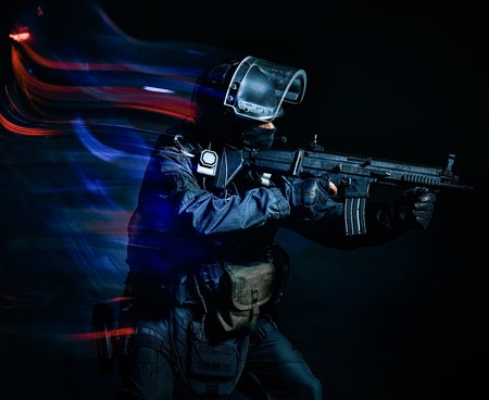 one soldier police swat tactical forces man studio shot isolated on black background