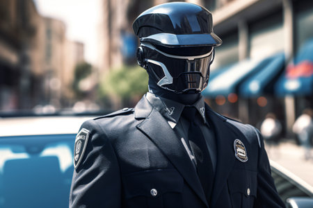 Amid the bustling urban backdrop, a figure stands tall, embodying the evolution of law enforcement. With a high-tech helmet and polished uniform, this sentinel represents the convergence of tradition and future.