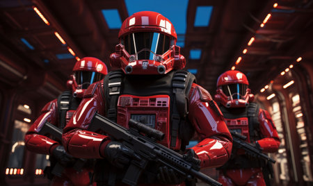 An AI generated illustration of three military personnel wearing red uniforms and holding weapons