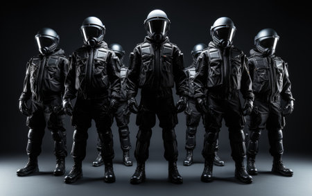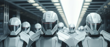 A squad of police robots with advanced armor stands ready, reflecting law enforcement and public safety in a futuristic setting. AI Generation