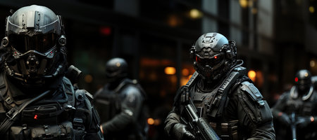 Soldiers on Night Patrol in City Streets, Stealth Guardians, Elite troops equipped with high-tech face masks and advanced stealth gear, AI Generated
