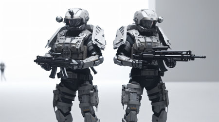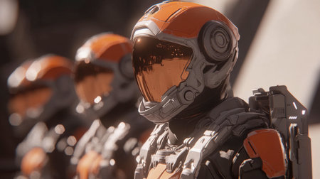 Futuristic soldiers wearing high-tech armor and helmets with glowing visors standing in formation