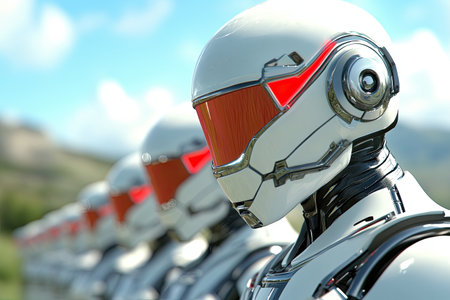A row of sleek, humanoid robots stands in a sunny outdoor setting, showing advanced technology on Science Fiction Day.