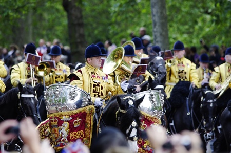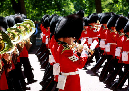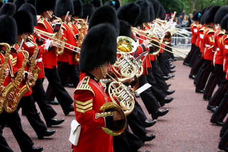 LONDON - JULY 4: Marching Band heads towards Buckingham Palace during Changing the Guard Ceremony on July 4, 2012 in London. Changing the Guard takes place at 11.30 am daily from May to July.