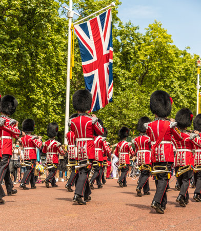 LONDON, UK - JUNE 17, 2022: Changing of the Guard ceremony in front of Buckingham Palace in London in a sunny summer day, UK